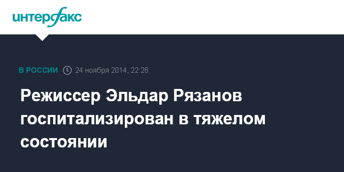 Москва. 24 ноября. INTERFAX.RU - Известный режиссер Эльдар Рязанов госпитализирован в тяжелом состоянии в госпиталь им. Бурденко, сообщил "Интерфаксу" источник в медицинских кругах.