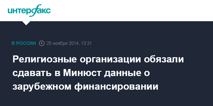 Москва. 25 ноября. INTERFAX.RU - Религиозные организации будут обязаны представлять Минюсту отдельный отчет об источниках и размерах зарубежного финансирования, что не повлечет присвоения им статуса иностранного агента.