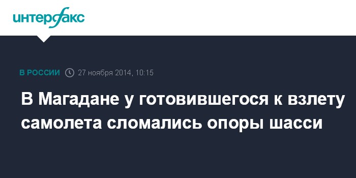 "В среду у самолета, который должен был вылететь по маршруту Магадан - Певек (Чукотка), при выезде со стоянки произошла поломка правых опор шасси", - сообщил в четверг агентству "Интерфакс" руководитель Северо-Восточного управления Росавиации Александр Бугаков.