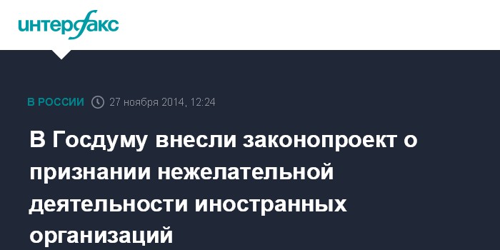 Москва. 27 ноября. INTERFAX.RU - В Госдуму внесен законопроект, который определяет процедуру признания нежелательной деятельности на территории России иностранных и международных организаций, представляющих угрозу основам конституционного строя страны и ее безопасности.