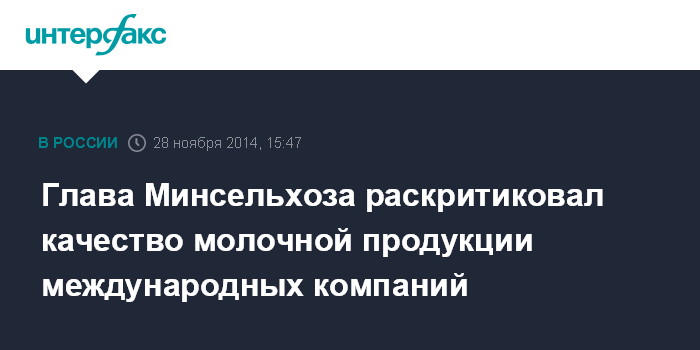 Москва. 28 ноября. INTERFAX.RU - Министр сельского хозяйства РФ Николай Федоров недоволен качеством молочной продукции, которую производят в РФ транснациональные корпорации.