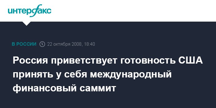 Москва. 22 октября. INTERFAX.RU - В Москве приветствуют готовность США принять у себя международный саммит, посвященный ситуации в мировой финансовой системе, заявила "Интерфаксу" пресс-секретарь президента Наталья Тимакова.