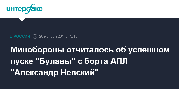 Москва. 28 ноября. INTERFAX.RU - Ракетный подводный крейсер стратегического назначения (РПКСН) Северного флота "Александр Невский" под командованием капитана 1 ранга Василия Танковида произвел успешный пуск межконтинентальной баллистической ракеты (МБР) "Булава" из назначенного района в акватории Баренцева моря по полигону Кура на Камчатке, сообщил "Интерфаксу" официальный представитель Минобороны России генерал-майор Игорь Конашенков