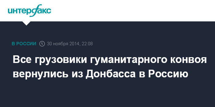Москва. 30 ноября. INTERFAX.RU - Все грузовики очередного гуманитарного конвоя, доставив грузы в Донбасс, вернулись в Ростовскую область, сообщил замначальника Национального центра управления в кризисных ситуациях (НЦУКС) МЧС России Олег Воронов.
