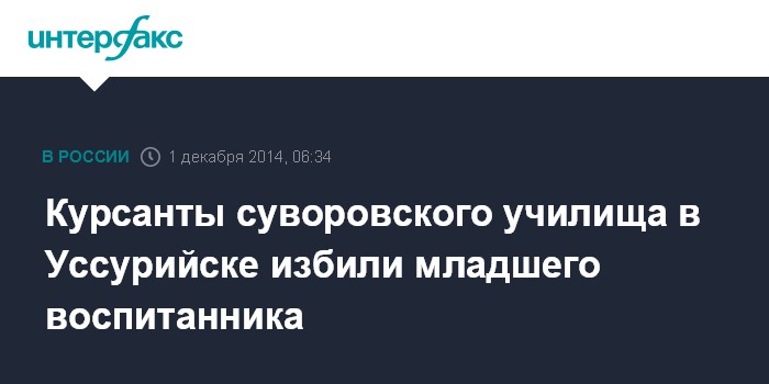 Москва. 1 декабря. INTERFAX.RU - Два 17-летних курсанта Уссурийского суворовского военного училища в помещении медицинского пункта в ходе ссоры избили 14-летнего курсанта, сообщила в понедельник агентству "Интерфакс" старший помощник руководителя СКР по Приморью Аврора Римская.