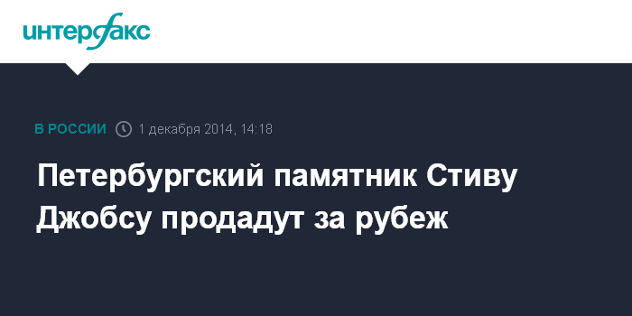 Москва. 1 декабря. INTERFAX.RU - Демонтированный памятник основателю Apple Стиву Джобсу, который стоял во дворе петербургского вуза, продадут за рубеж. Об этом "БалтИнфо" сообщили в пресс-службе Западно-европейского финансового союза (ЗЕФС) - организатора установки памятника.