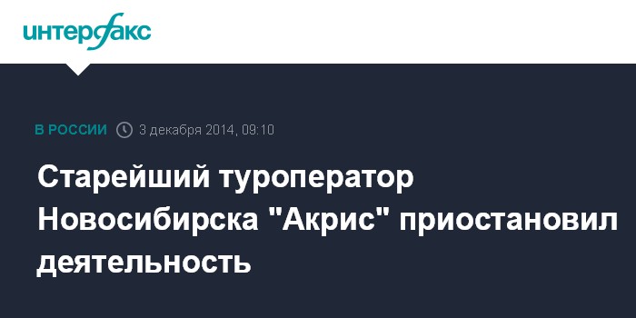 Москва. 3 декабря. INTERFAX.RU - Один из самых крупных туроператоров Новосибирска, компания "Акрис", уведомила в среду своих партнеров о приостановке деятельности, число ее туристов, находящихся на отдыхе и купивших путевки, достигает 1,5 тысяч человек.