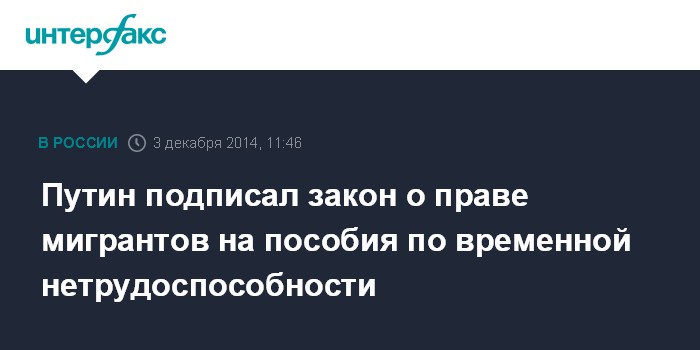 Путин подписал закон о праве мигрантов на пособия по временной нетрудоспособности