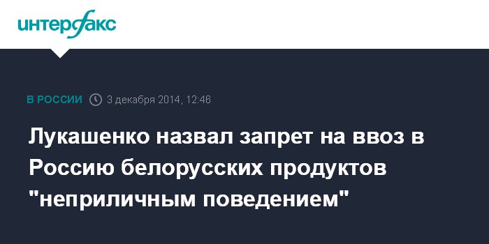 "Россия повела себя неприлично, запретив многим предприятиям поставку продовольственных товаров на территорию РФ. Россия пошла на нарушение всех наших договоренностей, которых мы достигли в Таможенном союзе", - заявил Лукашенко в среду, принимая доклад членов правительства.