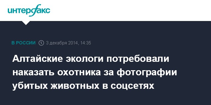 Москва. 3 декабря. INTERFAX.RU - Экологи в Алтайском крае пытаются добиться наказания в отношении охотника, который выложил в одну из социальных сетей около 50 фотографий, по их мнению, свидетельствующих о браконьерской охоте и глумлении над убитыми животными.
