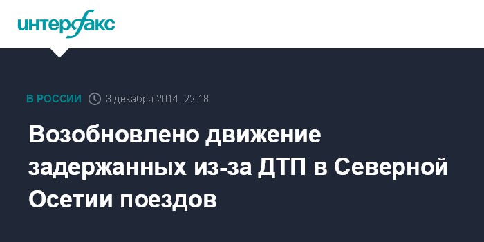 Москва. 3 декабря. INTERFAX.RU - Движение поездов "Владикавказ-Адлер" и "Владикавказ-Москва" восстановлено после устранения последствий ДТП на железнодорожных путях в Северной Осетии, сообщили агентству "Интерфакс" в пресс-службе ГУ МЧС по Северной Осетии вечером в среду.