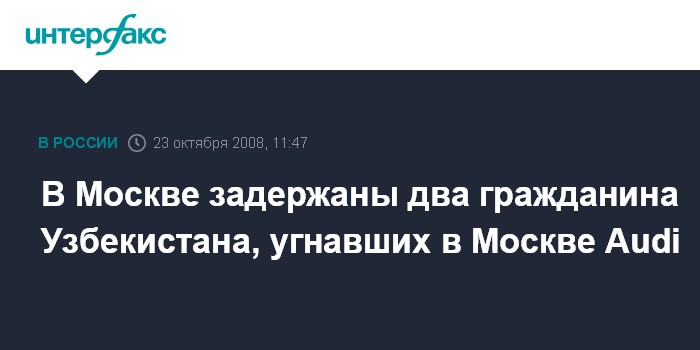 Москва. 23 октября. INTERFAX.RU - Два жителя Узбекистана 32 и 28 лет задержаны в Москве за угон автомобиля Audi A-6, сообщил "Интерфаксу" источник в правоохранительных органах в четверг.