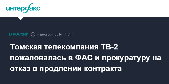 Москва. 4 декабря. INTERFAX.RU - Независимая томская телекомпания ТВ-2 подала жалобы в ФАС и прокуратуру на действия ОТРПЦ (РТРС "Томский областной радиотелевизионный передающий центр"), заявившего об отказе пролонгировать контракт на предоставление вещания с 1 января 2015 года.