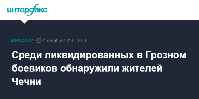 Москва. 4 декабря. INTERFAX.RU - Опознаны четверо убитых в результате спецоперации в Грозном боевиков, все они жители Чечни, сообщил "Интерфаксу" по телефону источник в силовых структурах СКФО.