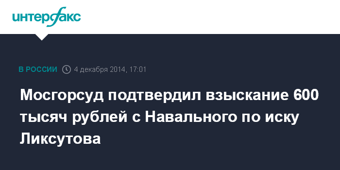 Москва. 4 декабря. INTERFAX.RU - Мосгорсуд признал законным решение суда первой инстанции, взыскавшей с оппозиционера Алексея Навального 600 тыс. руб. по иску о защите чести и достоинства в пользу заммэра столицы по вопросам транспорта Максима Ликсутова.