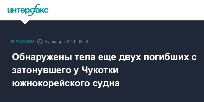 Москва. 5 декабря. INTERFAX.RU - Найдены тела еще двух моряков, погибших при крушении в Беринговом море южнокорейского траулера "Орионг-501", сообщил начальник морского координационно-спасательного подцентра ФГУ "Администрация морского порта Петропавловск-Камчатский" Артур Рец.