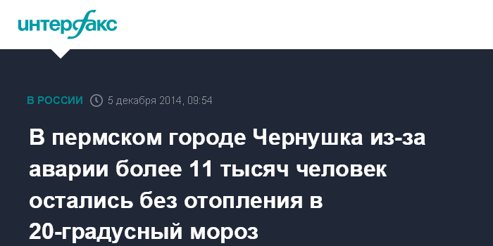 Москва. 5 декабря. INTERFAX.RU - Авария на коммунальных сетях оставила утром в пятницу без теплоснабжения более 11 тыс. жителей города Чернушка в Пермском крае, сообщает пресс-служба приволжского регионального центра МЧС России.