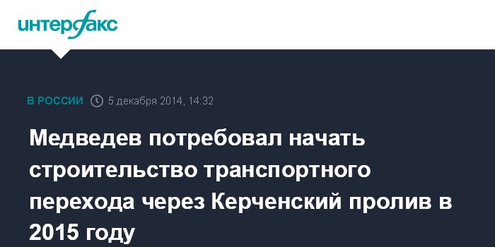 Москва. 5 декабря. INTERFAX.RU - Строительство моста через Керченский пролив должно быть начато в 2015 году, заявил премьер-министр РФ Дмитрий Медведев.