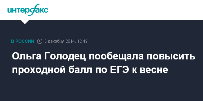 Москва. 6 декабря. INTERFAX.RU - Правительство весной подготовит решение о повышении проходного балла ЕГЭ для поступления в вузы, сообщила вице-премьер Ольга Голодец.