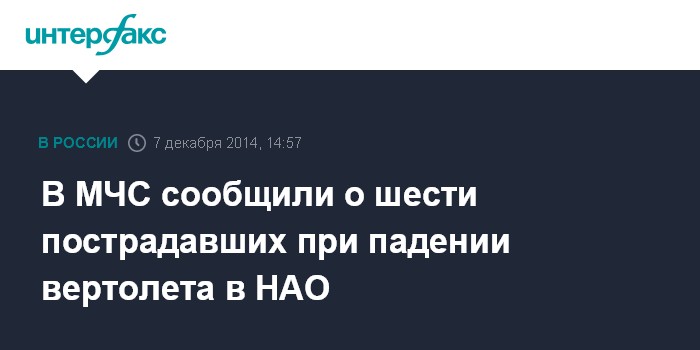 Москва. 7 декабря. INTERFAX.RU - Шесть человек пострадали в результате падения вертолета в Ненецком автономном округе в воскресенье, сообщили "Интерфаксу" в северо-западном региональном центре МЧС.