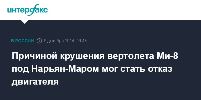 Москва. 8 декабря. INTERFAX.RU - Комиссия по расследованию крушения вертолета Ми-8 под Нарьян-Маром рассматривает в качестве основной причины трагедии отказ двигателя, сообщил "Интерфаксу" источник в оперативном штабе по проведению поисково-спасательной операции.
