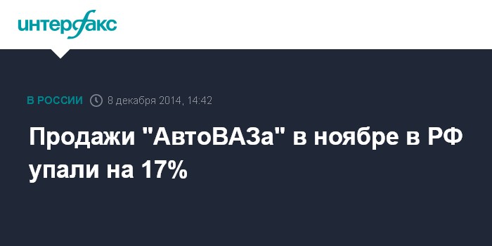 Москва. 8 декабря. INTERFAX.RU - Продажи ОАО "АвтоВАЗ" в РФ в ноябре 2014 года снизились на 17% по сравнению с ноябрем 2013 года - до 30,402 тыс. автомобилей, говорится в сообщении комитета автопроизводителей Ассоциации европейского бизнеса (АЕБ).