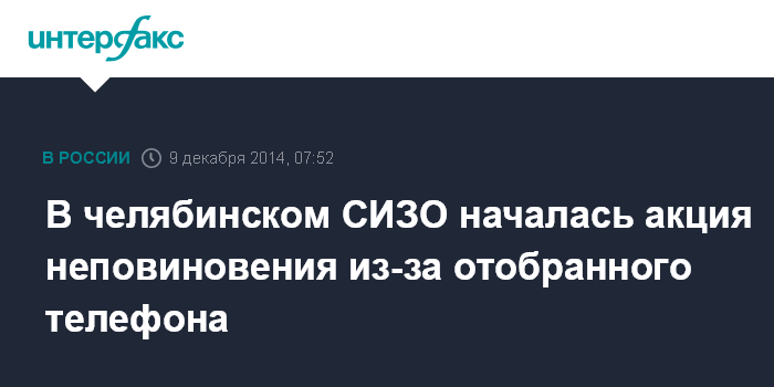 Москва. 9 декабря. INTERFAX.RU - Заключенные СИЗО-1 в Челябинске в ночь на вторник устроили акцию неповиновения, поддавшись призыву арестованного, у которого сотрудники учреждения нашли сотовый телефон, сообщает пресс-служба ГУФСИН России по Челябинской области.