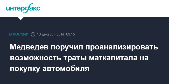 Москва. 10 декабря. INTERFAX.RU - Премьер-министр РФ Дмитрий Медведев по итогам совещания, которое состоялось 2 декабря, поручил рассмотреть вопрос о возможности использования средств материнского капитала на приобретение транспортных средств, говорится в сообщении на сайте правительства в среду.
