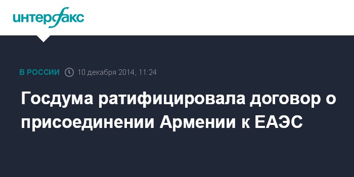 Москва. 10 декабря. INTERFAX.RU - Госдума в среду ратифицировала Договор о присоединении Республики Армения к Договору о Евразийском экономическом союзе (ЕАЭС).