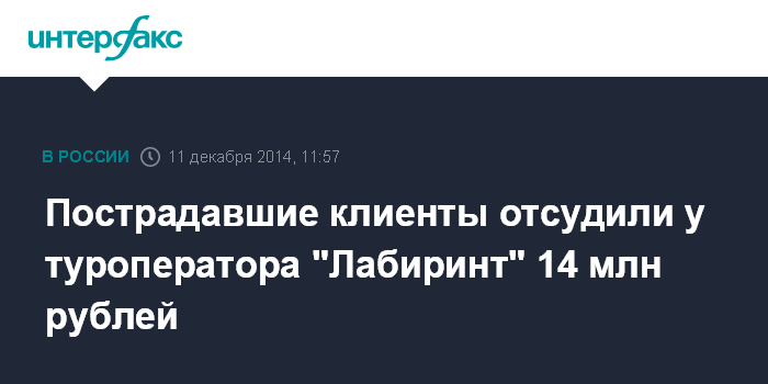 Москва. 11 декабря. INTERFAX.RU - Туристы, пострадавшие от приостановки деятельности туроператора "Лабиринт", отсудили у компании 14 млн рублей, сообщила "Интерфаксу" адвокат московской коллегии "Жорин и партнеры" Наталья Янчук.