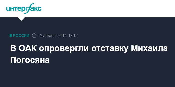 Руководитель департамента корпоративных коммуникаций ОАК сообщил, что накануне со ссылконй на российские источники киевский корреспдент информагентства "IHS Джейнс" Рубен Джонсон сообщил, что президент ОАК Михаих Погосян подал прошение об отставке.