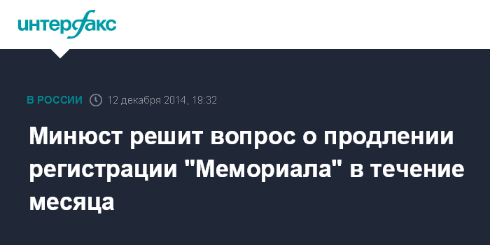 Москва. 12 декабря. INTERFAX.RU - Минюст в течение ближайшего месяца рассмотрит поступившие от правозащитного общества "Мемориал" уставные документы, после чего будет решать вопрос, продлять ли регистрацию организации, сообщили в пресс-службе министерства.