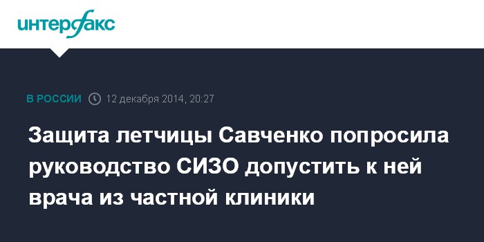 Москва. 12 декабря. INTERFAX.RU - Защита украинской летчицы Надежды Савченко, обвиняемой в России в пособничестве убийству российских журналистов, обратилась к руководству следственного изолятора, в котором она содержится, для допуска к ней врача-отоларинголога, так как опасается, что она может потерять слух.