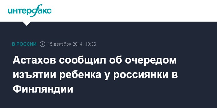 Москва. 15 декабря. INTERFAX.RU - Уполномоченный при президенте РФ по правам ребенка Павел Астахов сообщает об изъятии сына у россиянки в Финляндии.