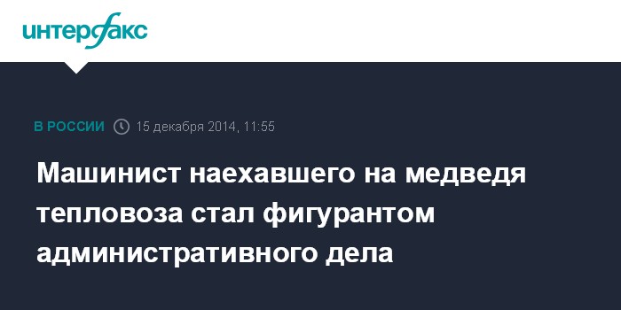 Москва. 15 декабря. INTERFAX.RU - Западно-Сибирская транспортная прокуратура возбудила административное дело в отношении машиниста тепловоза, наехавшего на медведя в Норильске, сообщает пресс-служба ведомства в понедельник.