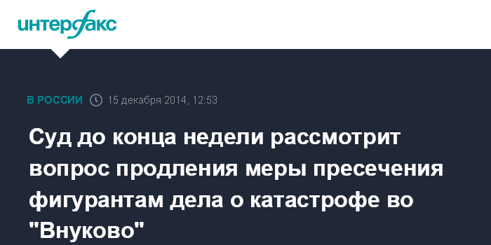 Москва. 15 декабря. INTERFAX.RU - Следствие ходатайствует о продлении меры пресечения на четыре месяца фигурантам уголовного дела об авиакатастрофе в аэропорту "Внуково" с участием самолета "Фалькон".