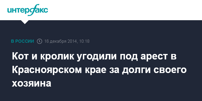 Москва. 16 декабря. INTERFAX.RU - Судебные приставы арестовали за долги жителя Минусинска Красноярского края его питомцев - кота и кролика.