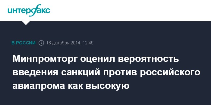 Москва. 16 декабря. INTERFAX.RU - Минпромторг оценивает вероятность введения санкций против российской авиапромышленности как "высокую" (вероятность реализации 51-75%), говорится в документах ведомства, размещенных на едином портале regulation.gov.ru к проекту постановления правительства об утверждении госпрограммы "Развитие авиационной промышленности" до 2025 г.