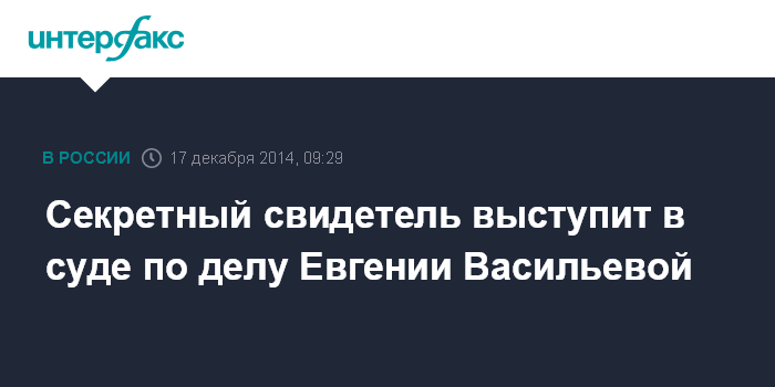 Москва. 17 декабря. INTERFAX.RU - Пресненский суд Москвы в среду заслушает секретного свидетеля по делу бывшего руководителя департамента имущественных отношений Минобороны РФ Евгении Васильевой, обвиняемой в мошенничестве.