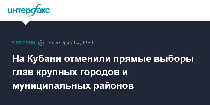Москва. 17 декабря. INTERFAX.RU - Законодательное собрание Краснодарского края в среду внесло изменения в закон "О местном самоуправлении", которые отменяют прямые выборы глав муниципальных районов и городских округов, а также вводят институт "сити-менеджеров".