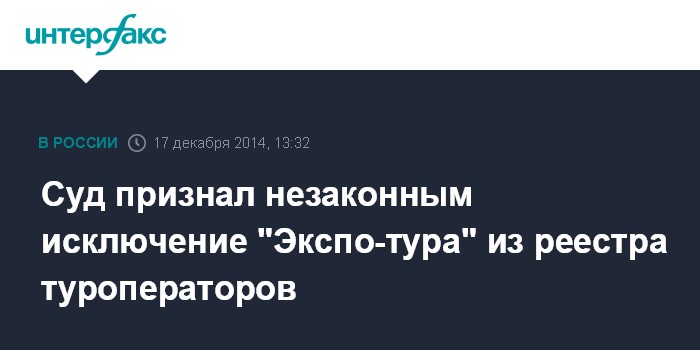 Москва. 17 декабря. INTERFAX.RU - Арбитражный суд Москвы в среду удовлетворил иск ООО "Экспо-тур" и признал незаконным приказ Федерального агентства по туризму (Ростуризм) от 9 июня 2014 года об исключении компании из единого реестра туроператоров.