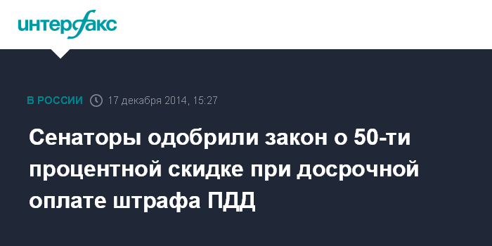 Москва. 17 декабря. INTERFAX.RU - Совет Федерации одобрил в среду закон, допускающий в ряде случаев 50-процентную скидку при досрочной уплате штрафа за нарушение ПДД.
