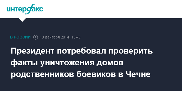 Москва. 18 декабря. INTERFAX.RU - Президент Владимир Путин заявил о том, что все возможные факты уничтожения жилья родственников террористов в Чечне должны быть проверены.