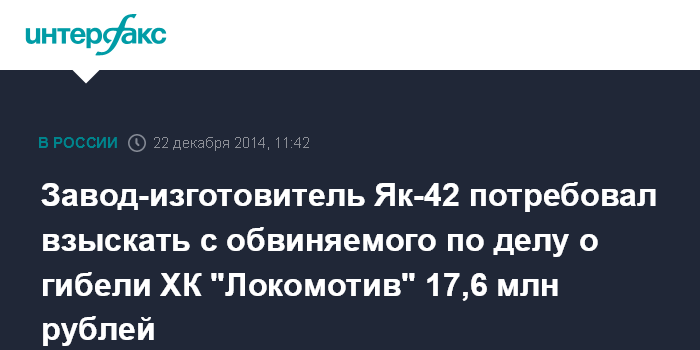 Завод-изготовитель Як-42 потребовал взыскать с обвиняемого по делу о гибели ХК "Локомотив" 17,6 млн рублей
