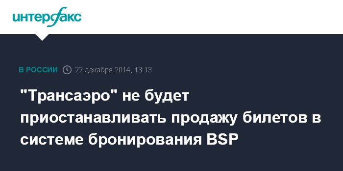 Москва. 22 декабря. INTERFAX.RU - Авиакомпания "Трансаэро" не будет приостанавливать взаимодействие с агентами системы бронирования BSP России, говорится в сообщении авиаперевозчика.