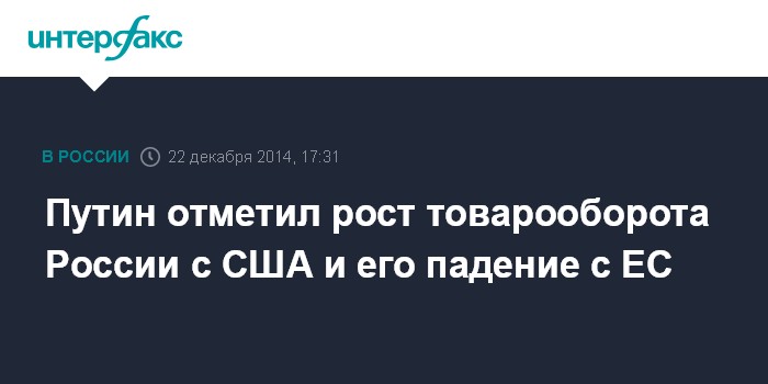 "С Евросоюзом у нас упал товарооборот на 4,3%, а импорт из этих стран уменьшился тоже где-то процентов на 7-8-10 примерно по разным странам. Правда, есть и некоторые положительные вещи, которые, когда я посмотрел статистику сегодня, меня немножко даже удивили. Скажем, у нас происходит увеличение товарооборота с другими странами, например, с США товарооборот вырос на 7%", - сказал Путин на встрече с представителями Федерального собрания.