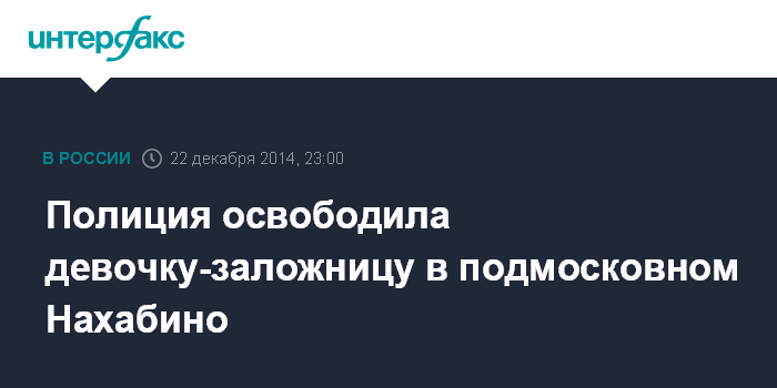 Москва. 22 декабря. INTERFAX.RU - Полиция освободила девочку, которую неизвестный мужчина удерживал в заложницах в подмосковном городе Нахабино, сообщили "Интерфаксу" в подмосковной полиции.