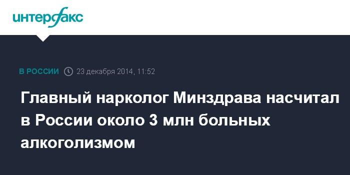 "Больных алкоголизмом с психическими расстройствами, которые у нас находятся на учете, их - 2,7 млн человек на страну. Реальная цифра примерно соответствует официальным данным - около 3 млн должно быть в стране больных алкоголизмом", - заявил Брюн во вторник на пресс-конференции в центральном офисе "Интерфакса".