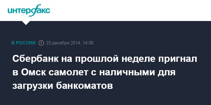 Москва. 23 декабря. INTERFAX.RU - Сбербанк России в период ажиотажного спроса населения на валюту на прошлой неделе был вынужден пригнать в Омск самолет с наличными деньгами для своевременной загрузки банкоматов, сообщил губернатор Омской области Виктор Назаров на пресс-конференции во вторник.