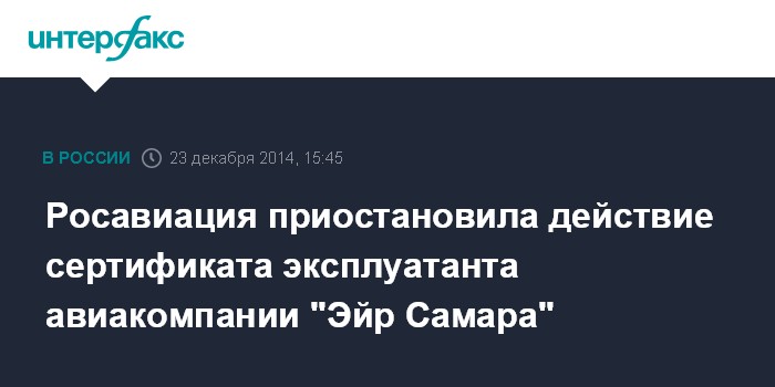 Москва. 23 декабря. INTERFAX.RU - Федеральное агентство воздушного транспорта (Росавиация) приостановило действие сертификата эксплуатанта авиакомпании "Эйр Самара", сообщили "Интерфаксу" в пресс-службе ведомства.